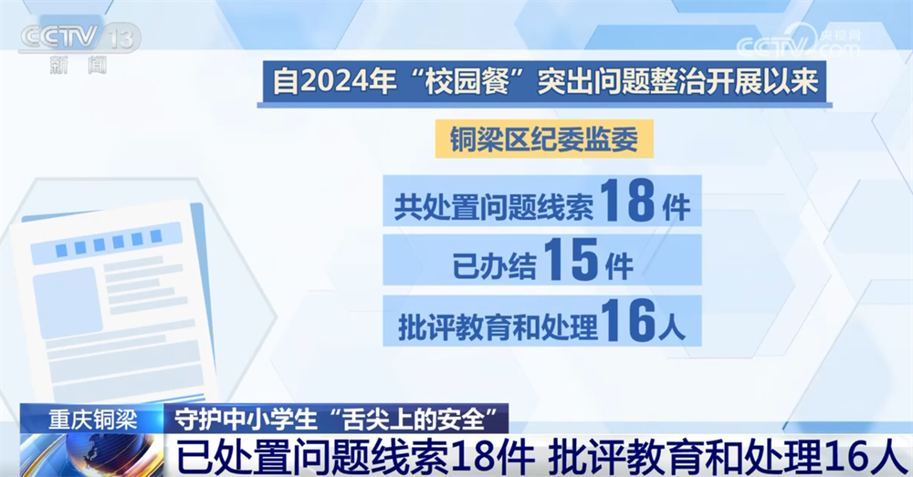针对这些问题,铜梁区纪委监委结合区教委、财务、市场监管等部分持续加强监视查抄,严查快处发觉的违纪违法问题。自2024年“校园餐”凸起问题整治开展以来,共措置问题耳目。同时,用餐等轨制进行,要肄业校食材的采购、验收和加工过程、标注原料品种和数量的养分食谱等向监管部分、学生家长等进行公开。学校食堂要实现师生用餐的食材同源、师生菜品同锅加工、同窗取餐,就餐场合师生共享,鞭策食堂“阳光运转”,常态化接管监视。
