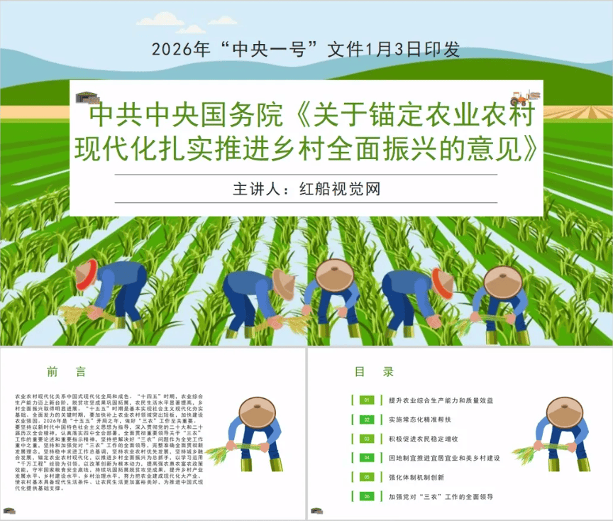 以来,第14个指点“三农”工做的地方一号文件2026年2月3日由受权发布,对锚定农业农村现代化、结实推进村落全面复兴进行了摆设。2026年地方一号文件正在延续2025年一号文件无力无效推进村落全面复兴”总体基调的根本上,呈现出阶段性深化、系统性强化、方针性具象化的明显特征。全文进修2026年地方一号文件《关于锚定农业农村现代化结实推进村落全面复兴的看法》PPT课件,讲稿字数:7637字,党课ppt页数:38页。